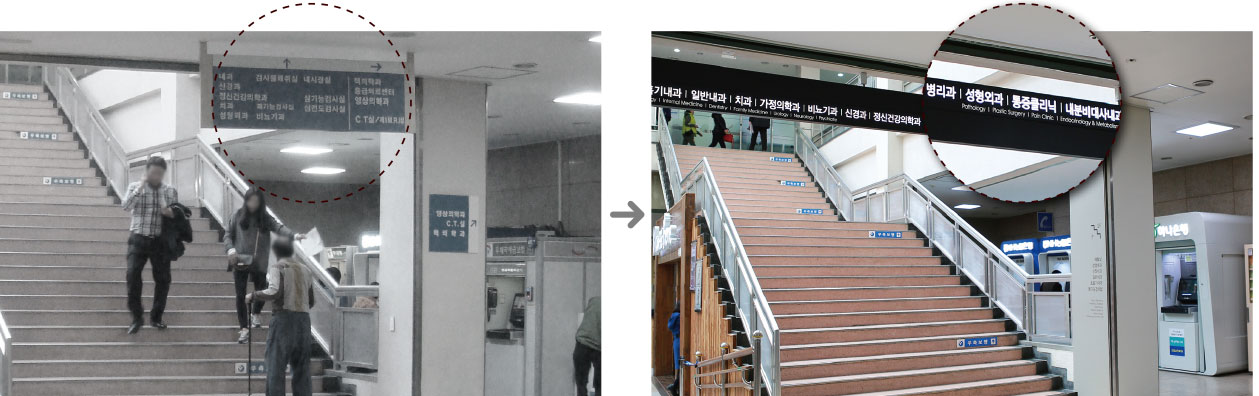 시설의 방향을 주로 알리는 매달림 간판과 벽면 부착식 안내표지를 갈림길마다 추가 설치, 다양한 시설로의 이동을 훨씬 수월하게 했다. 본관 건물과 연결되는 암센터, 응급센터, 노인센터, 소아동 등의 글씨는 각 건물의 고유 색과 줄임명칭을 그대로 적용해 일관성을 띤다. 간판 형태 역시 전체적인 규모와 문자 크기는 이전보다 줄었지만 가독성은 이전보다 뛰어나다.