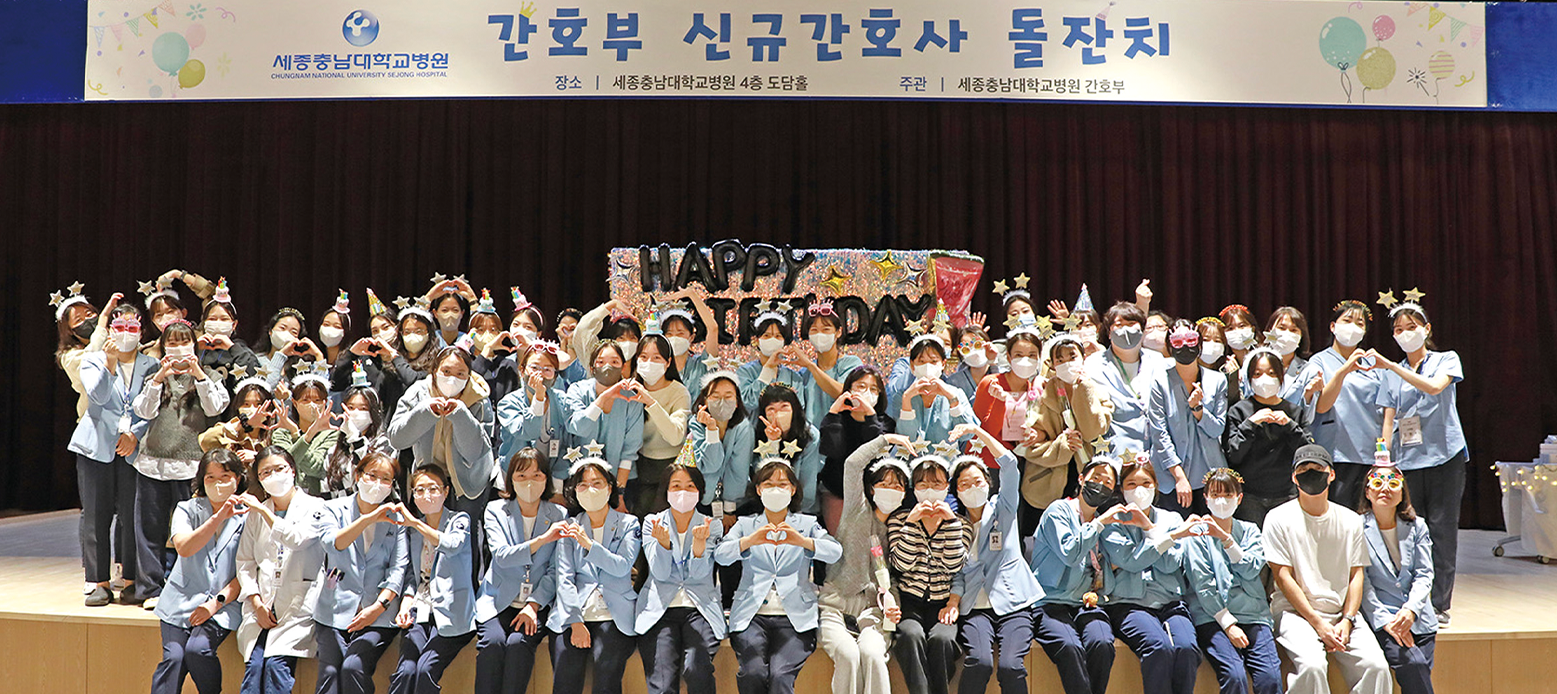 11월 16일과 17일 이틀간 4층 제4회 간호부 신규간호사 돌잔치 Cheer Up Day를 열었다. 이날 행사는 2022년 1월~12월까지 입사한 신규간호사 113명을 대상으로 지난 1년간 병원 환경 및 업무 적응을 위해 애쓴 노고를 격려하고 간호사로서 자부심과 소속감을 높이기 위해 마련됐다. 신수희 간호부장의 축사로 시작된 돌잔치는 반짝이는 날들을 응원해와 나의 1년을 돌아보며란 주제로 선배 간호사들의 응원 영상과 손편지를 전달하며 서로의 따뜻한 마음을 전하고, 앞으로를 다짐하는 시간을 가졌다. 이날 행사에 참석한 신규간호사들은 동기들과 끈끈한 동료애가 생기는 뜻깊은 시간이었고, 간호사로서의 자부심과 세종충남대학교병원에 대한 소속감을 높이는 기회가 됐다.